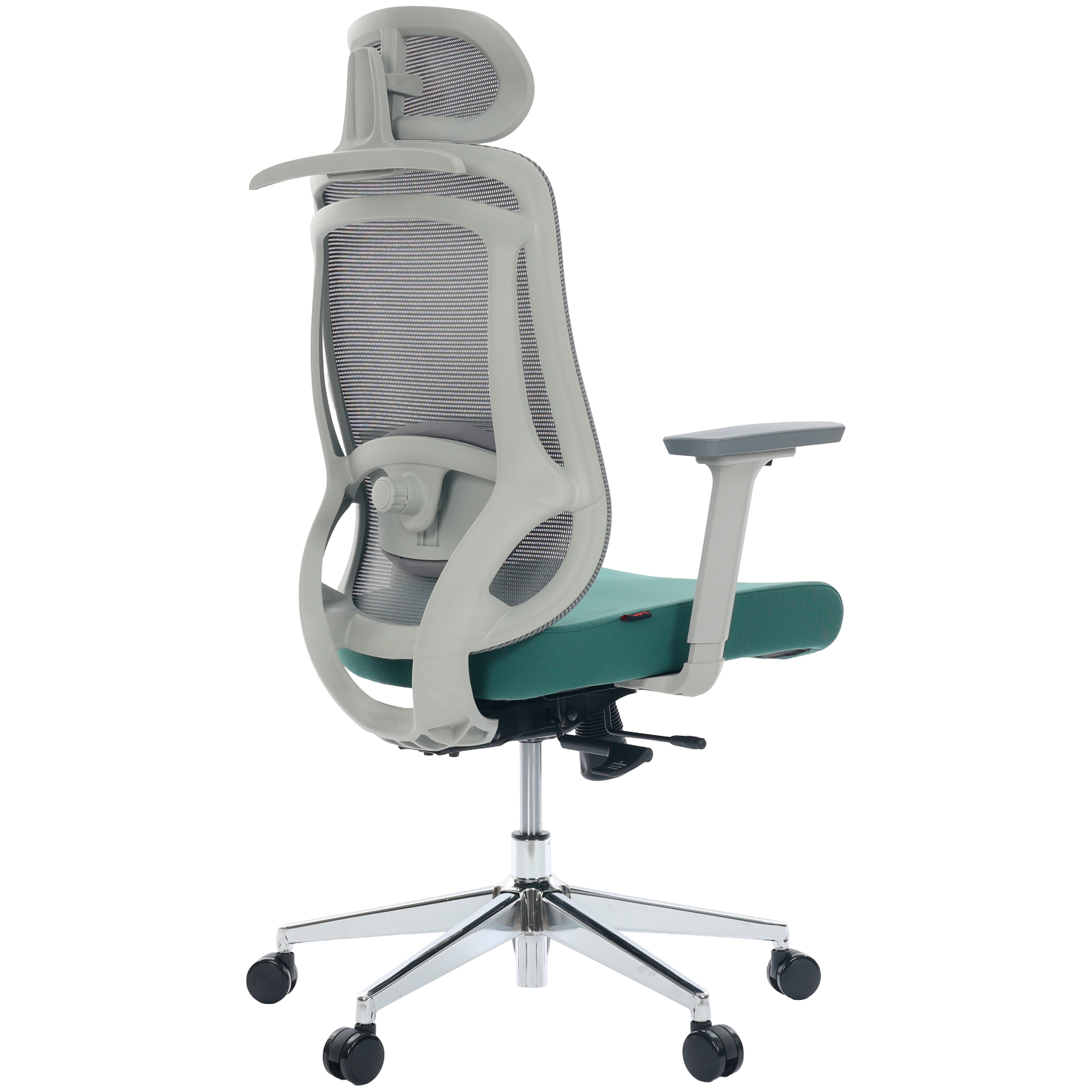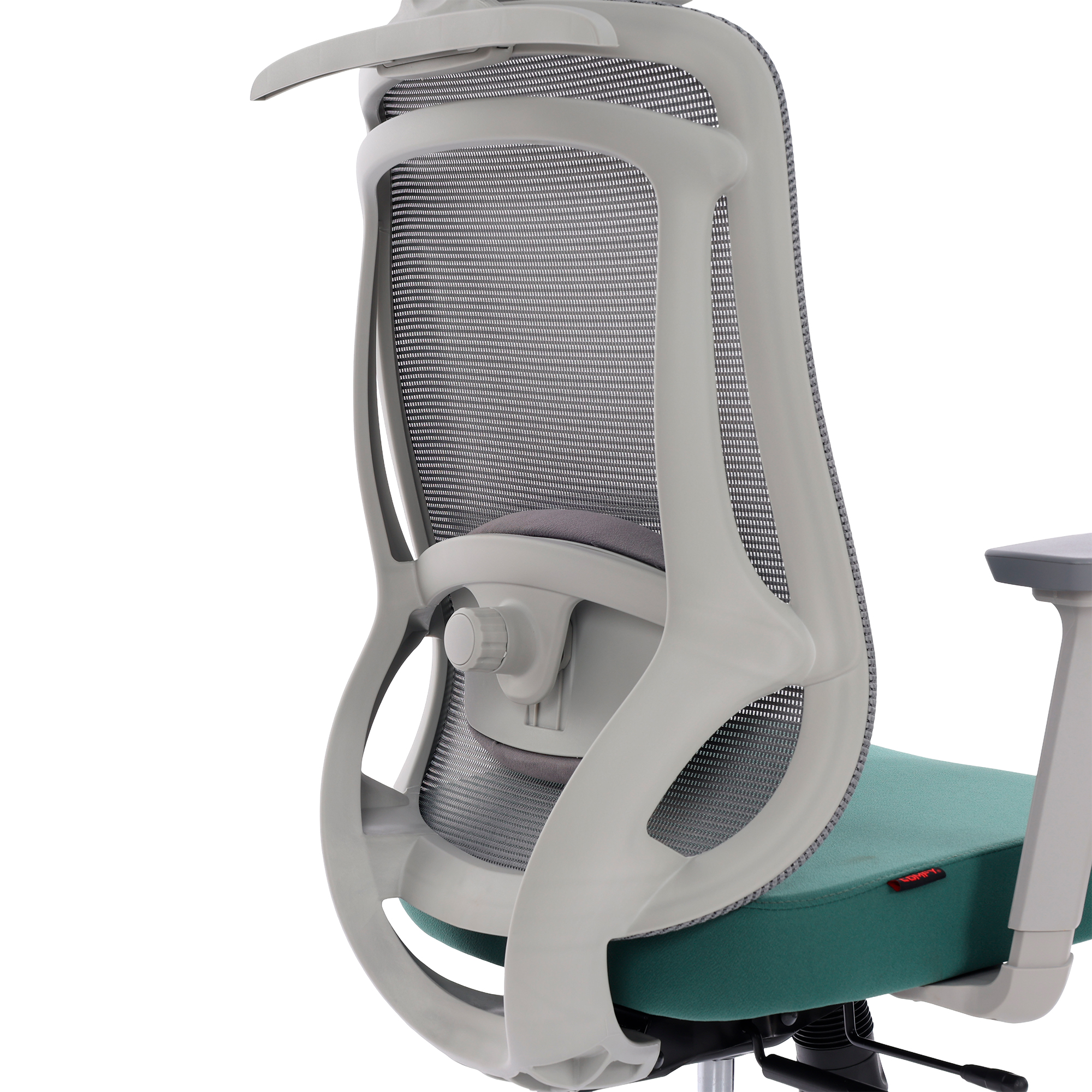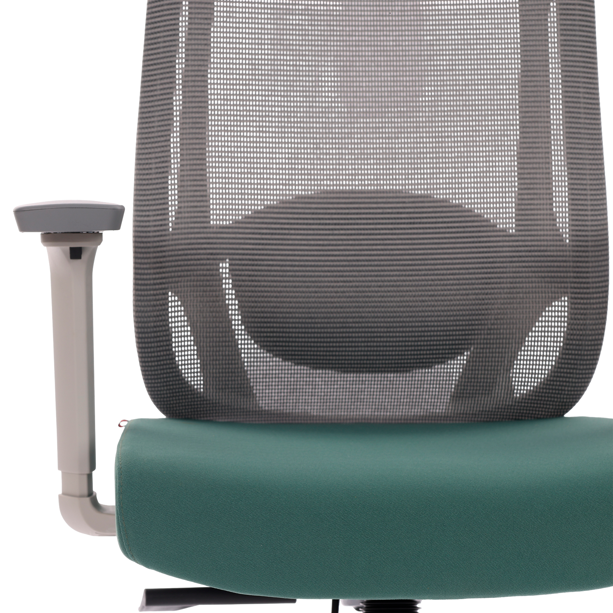 A Comfy Aurora Verde Sálvia combina tela mesh cinza com assento em tecido verde, criando uma estética leve, contemporânea e elegante para ambientes profissionais e home office.