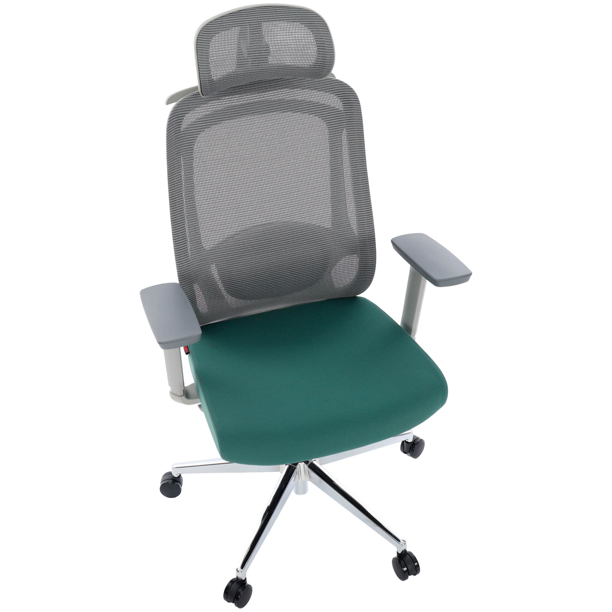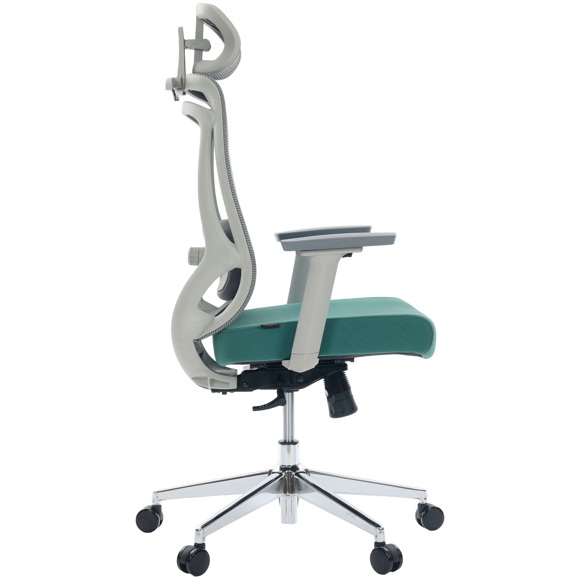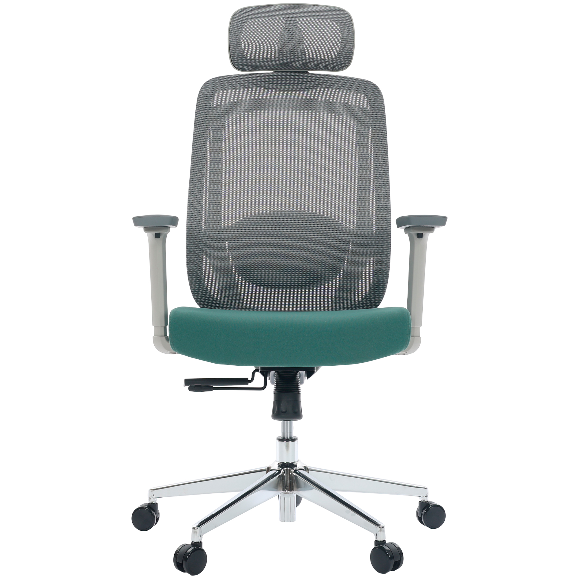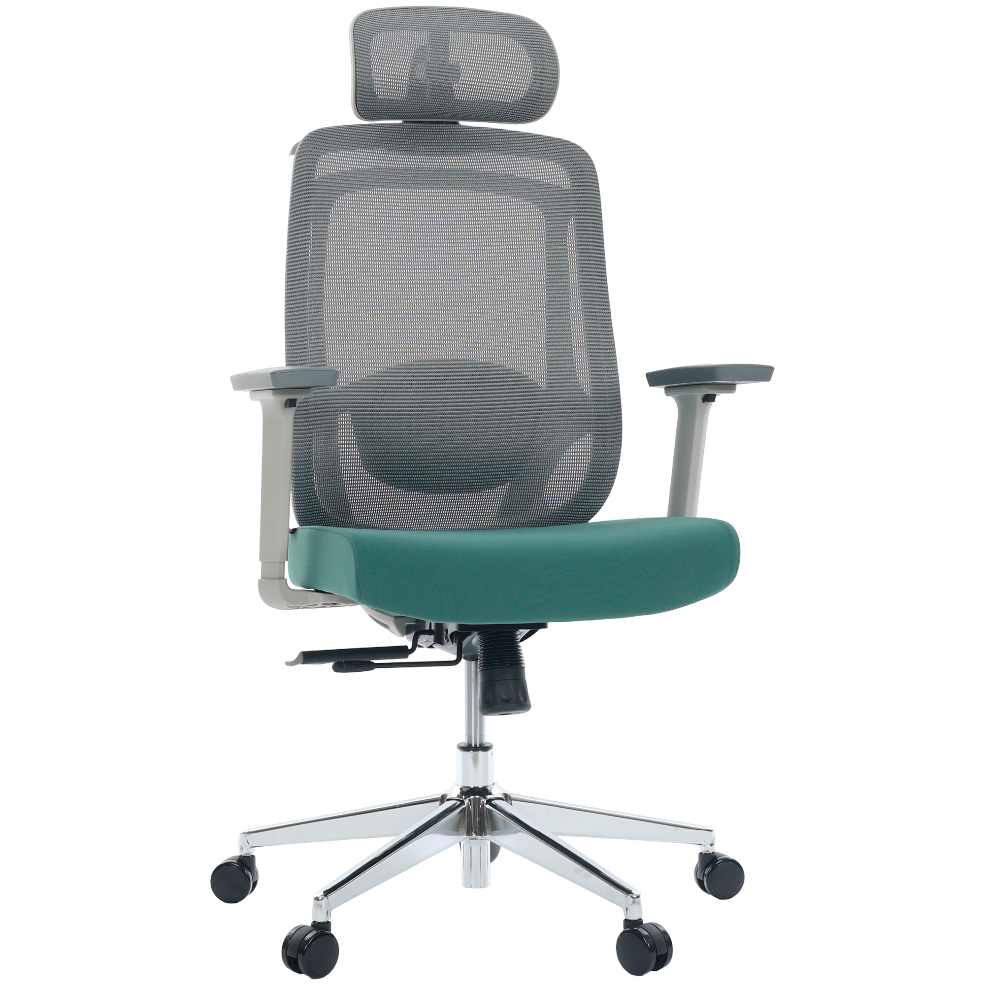 A Comfy Aurora Verde Sálvia combina tela mesh cinza com assento em tecido verde, criando uma estética leve, contemporânea e elegante para ambientes profissionais e home office.