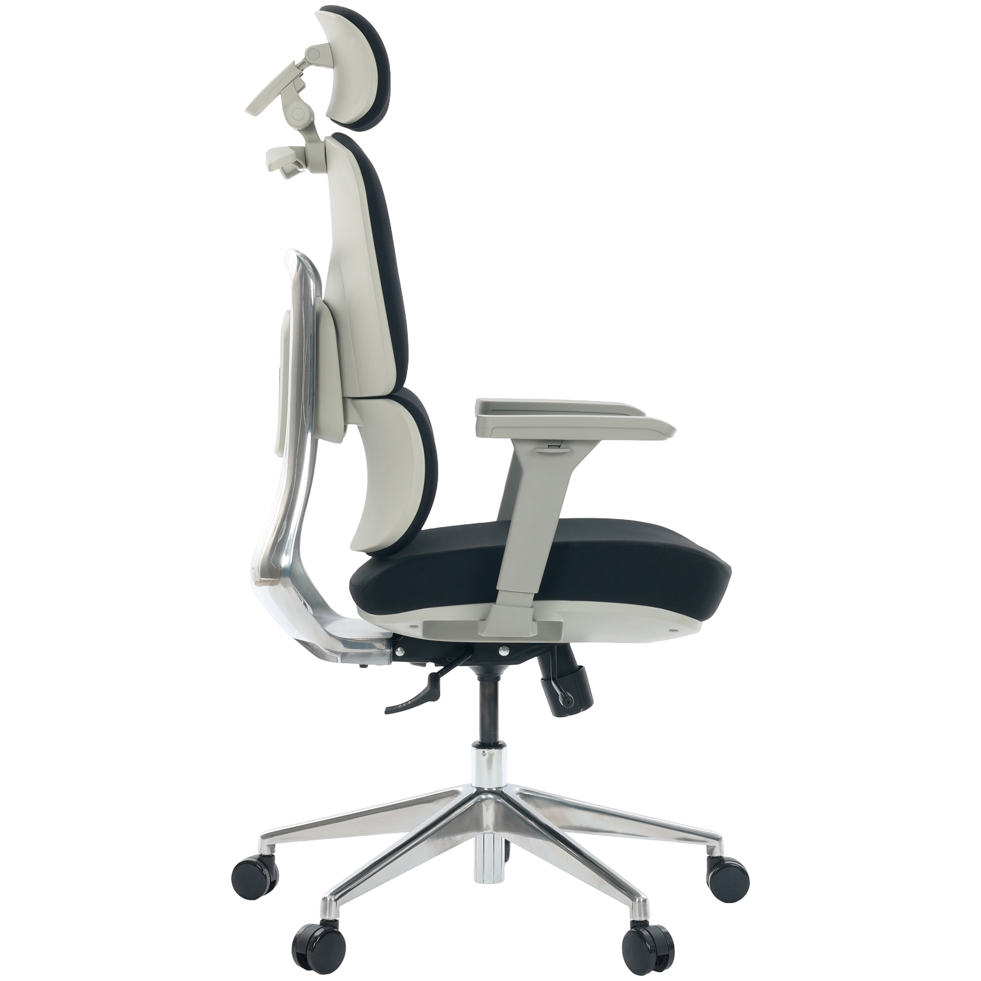 Encosto bipartido com ajuste de altura e apoio de cabeça para distribuir melhor a carga da cervical à lombar.