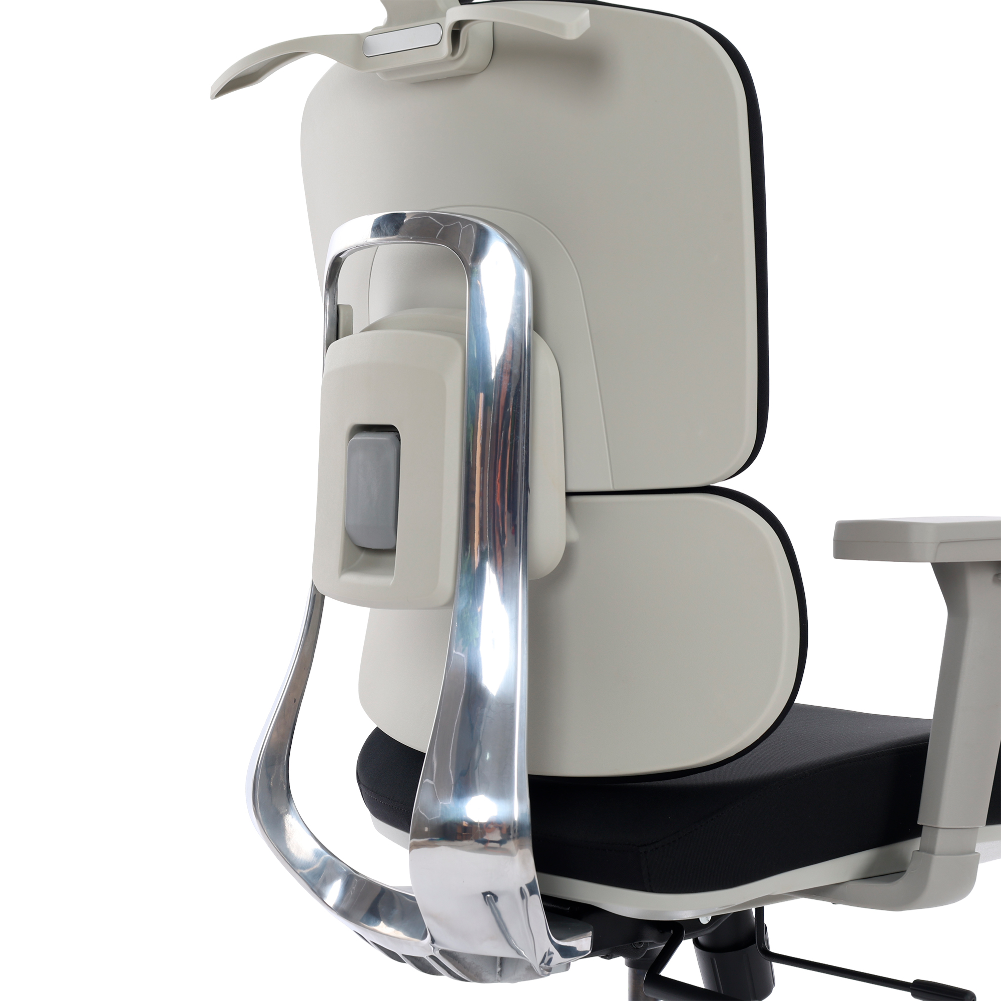 O encosto bipartido com ajuste de altura e apoio lombar regulável favorece alinhamento de cervical, torácica e lombar, distribuindo melhor a carga ao longo da coluna.