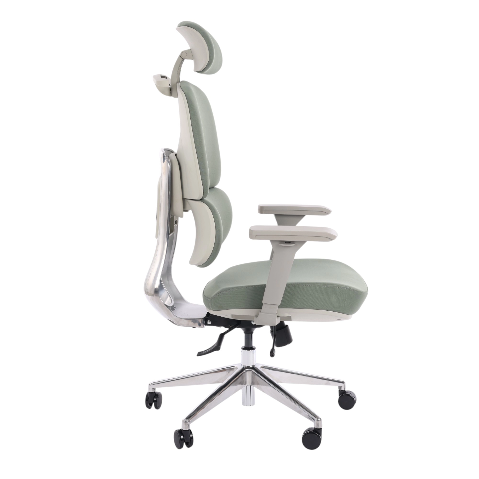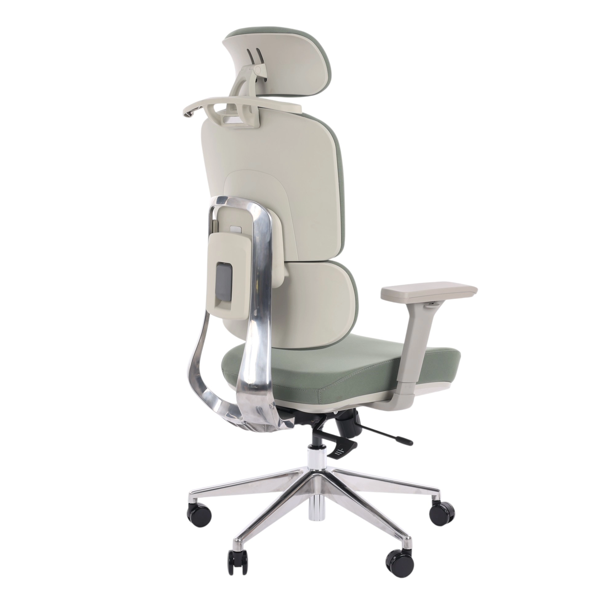 Seu encosto, revestido com tecido verde e estofado também com espuma injetada de alta densidade, proporciona suporte inigualável para a coluna. A altura ajustável permite que você encontre a configuração ideal para a sua postura, garantindo que as costas recebam o apoio necessário para manter a saúde e o bem-estar ao longo do dia. A combinação entre conforto e ergonomia faz dessa cadeira a escolha perfeita para quem busca eficiência no trabalho.