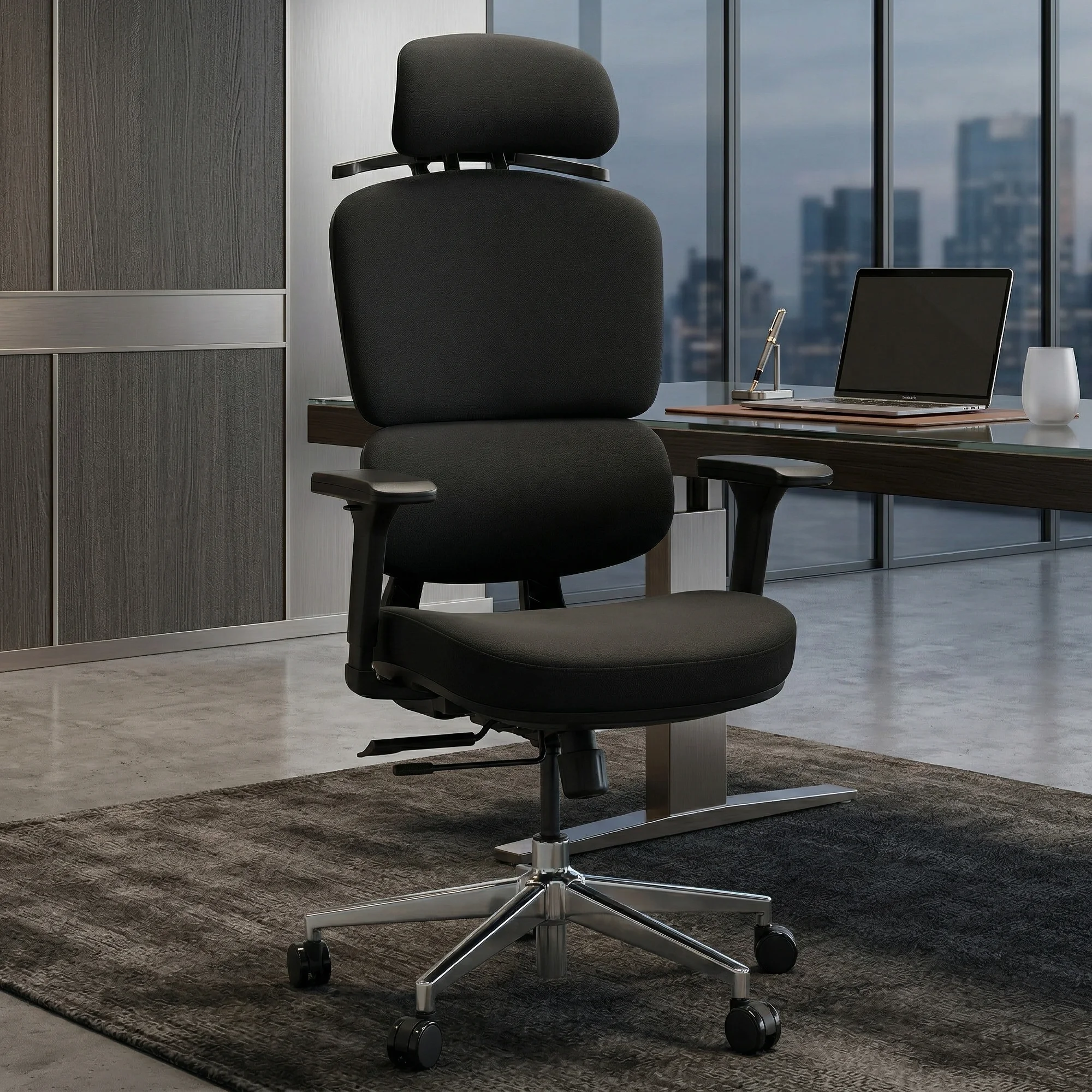 Revestida em tecido preto de alta qualidade e construída com materiais premium, ela entrega a combinação perfeita entre conforto prolongado e elegância para o ambiente corporativo ou home office.