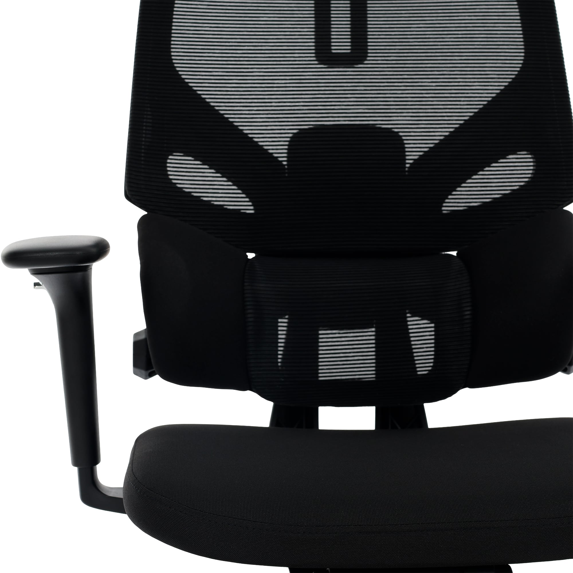 O suporte lombar 2D, com ajustes de ângulo e profundidade, complementa o sistema ergonômico, oferecendo apoio preciso à região lombar e contribuindo diretamente para a saúde da coluna.