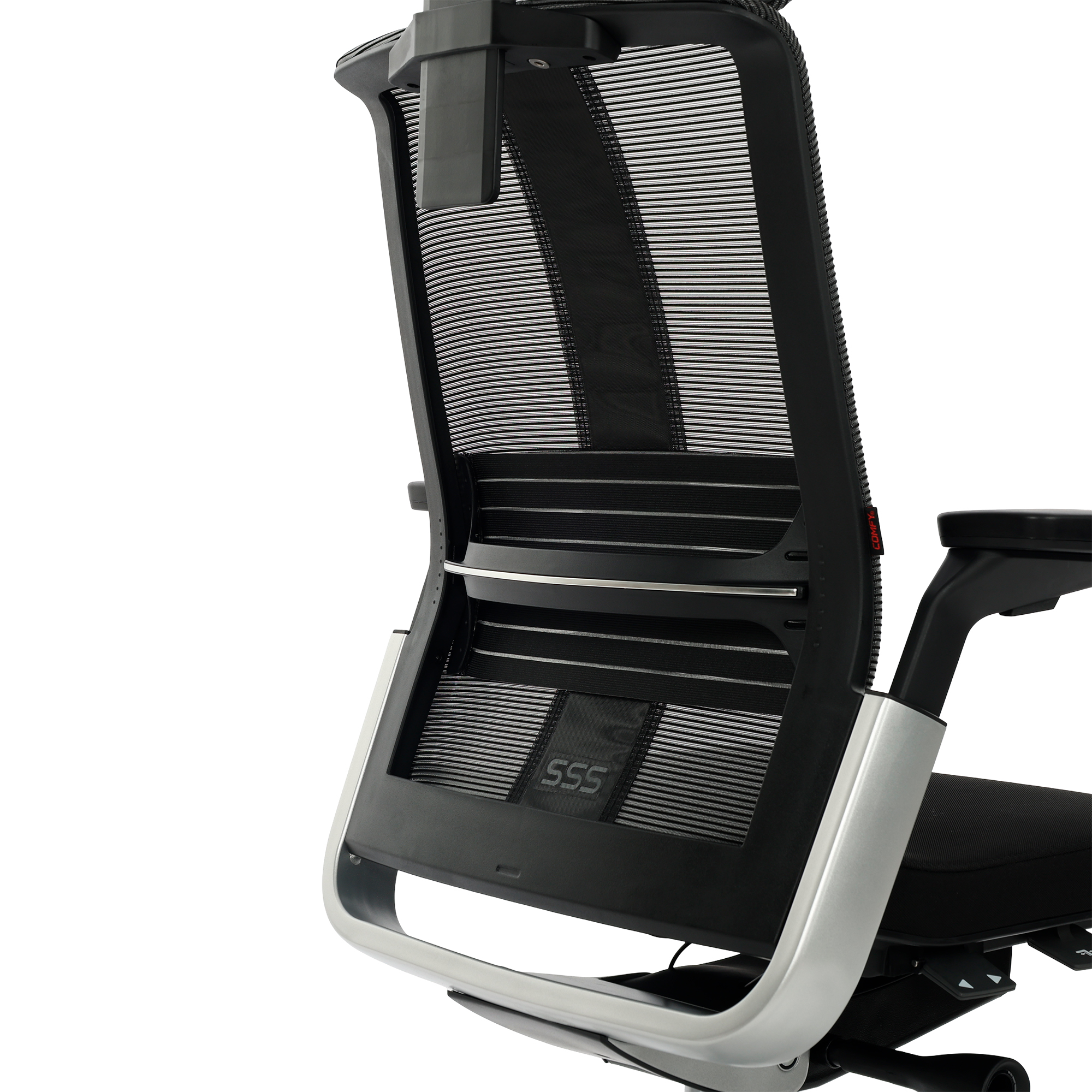 A versão SSS (Super Spine Support) possui um suporte lombar com maior rigidez e estabilidade, ideal para quem precisa de apoio mais firme na lombar para manter a postura correta por muitas horas.