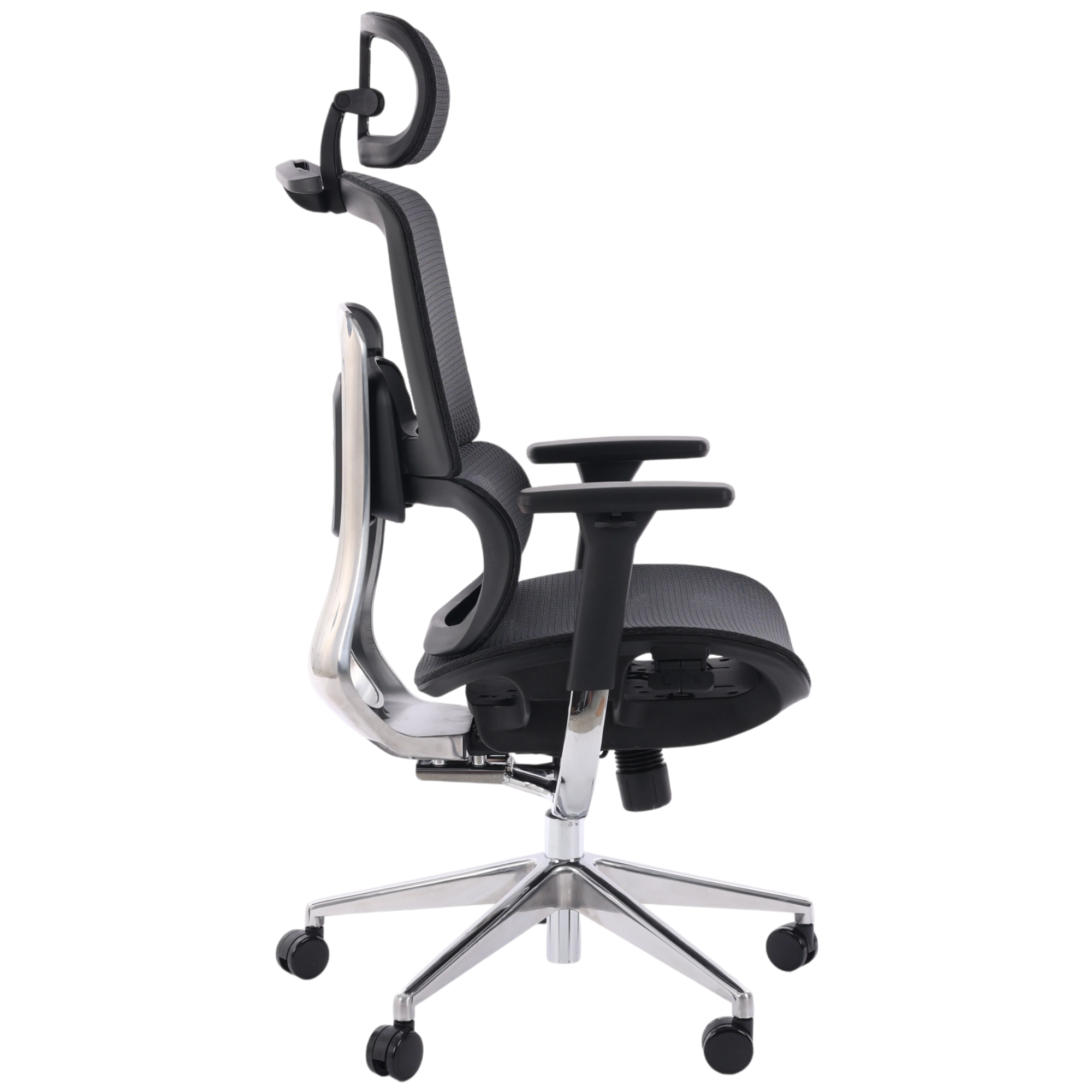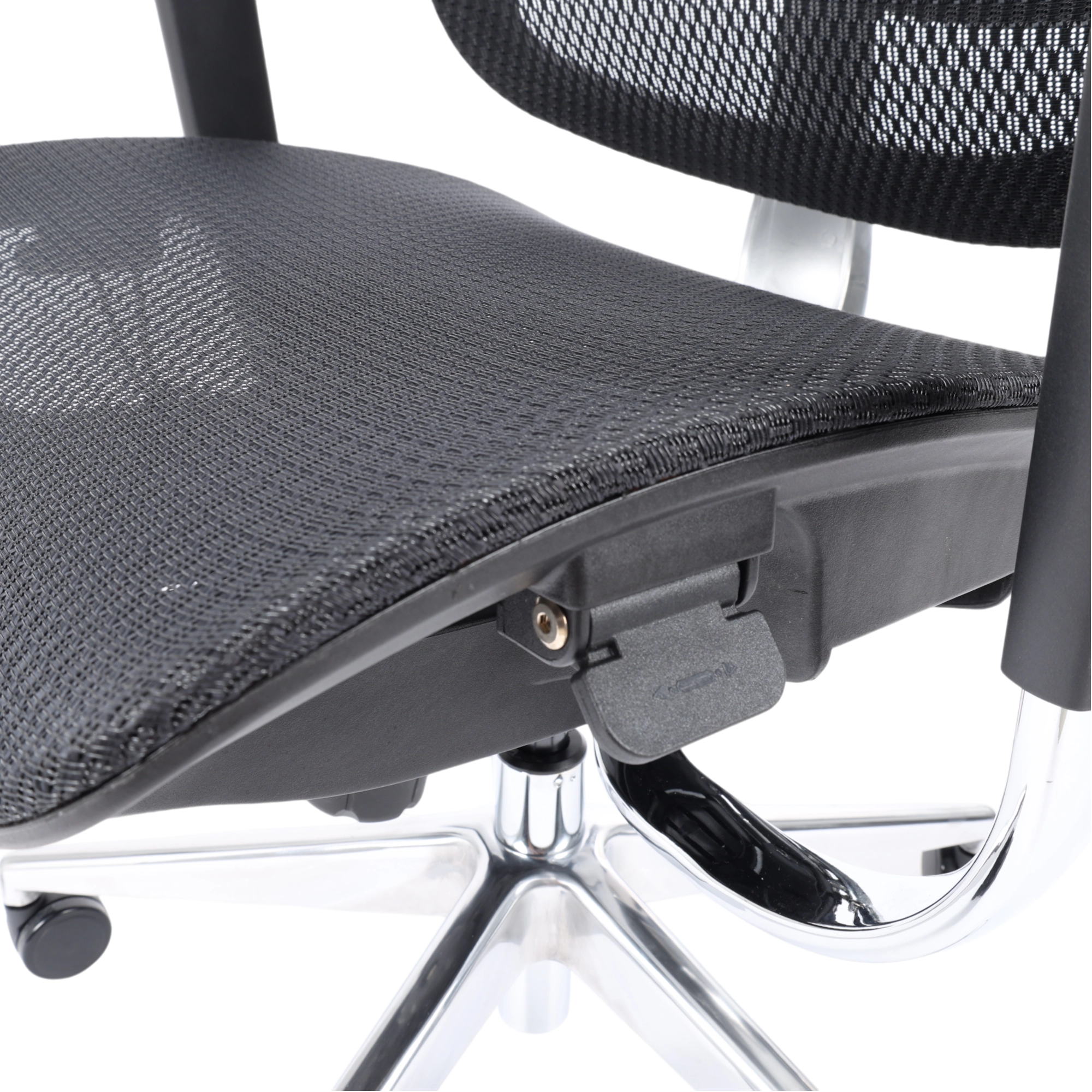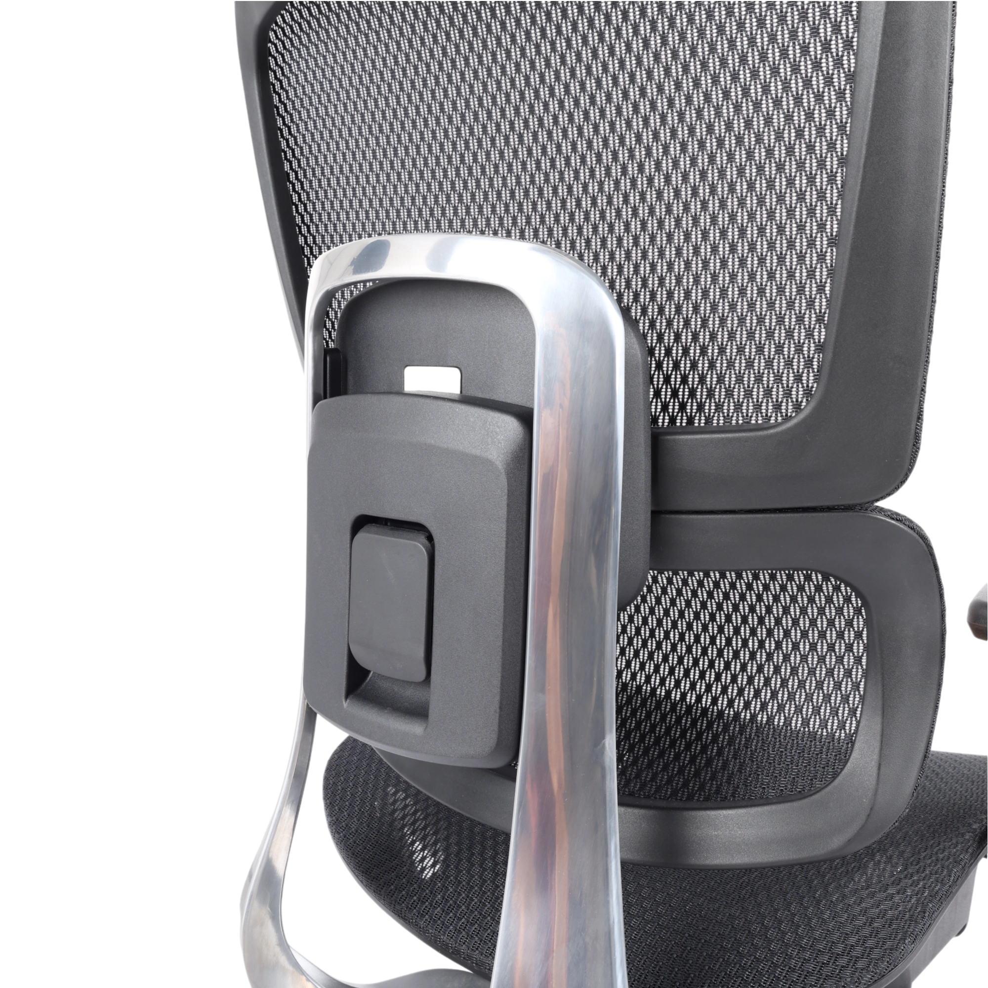 A estrutura em tela mesh de alta qualidade contribui para a durabilidade da cadeira, mantendo-a firme e resistente ao uso prolongado. A tecnologia de fabricação da tela garante que ela não se deforme com o tempo, preservando tanto a estética quanto a funcionalidade. O design sofisticado, com a estrutura preta combinada ao alumínio, agrega modernidade e estilo a qualquer ambiente de escritório.
