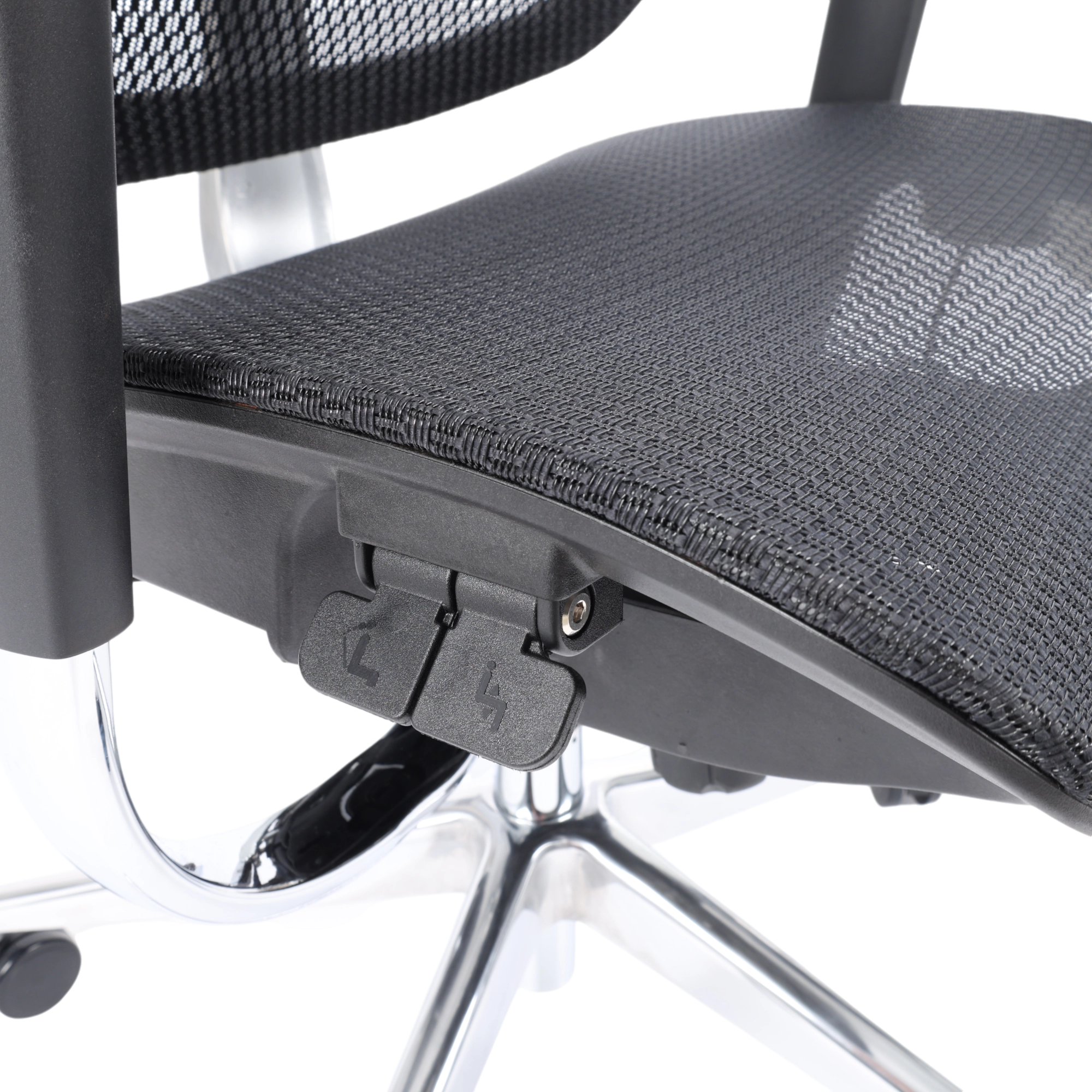O mecanismo de assento deslizante oferece ajuste de profundidade de até 5 cm, adaptando a cadeira a diferentes envergaduras de pernas e promovendo melhor circulação sanguínea nas coxas. O suporte lombar 1D ajustável em altura mantém a curvatura natural da coluna, aliviando tensões na região dorsal.