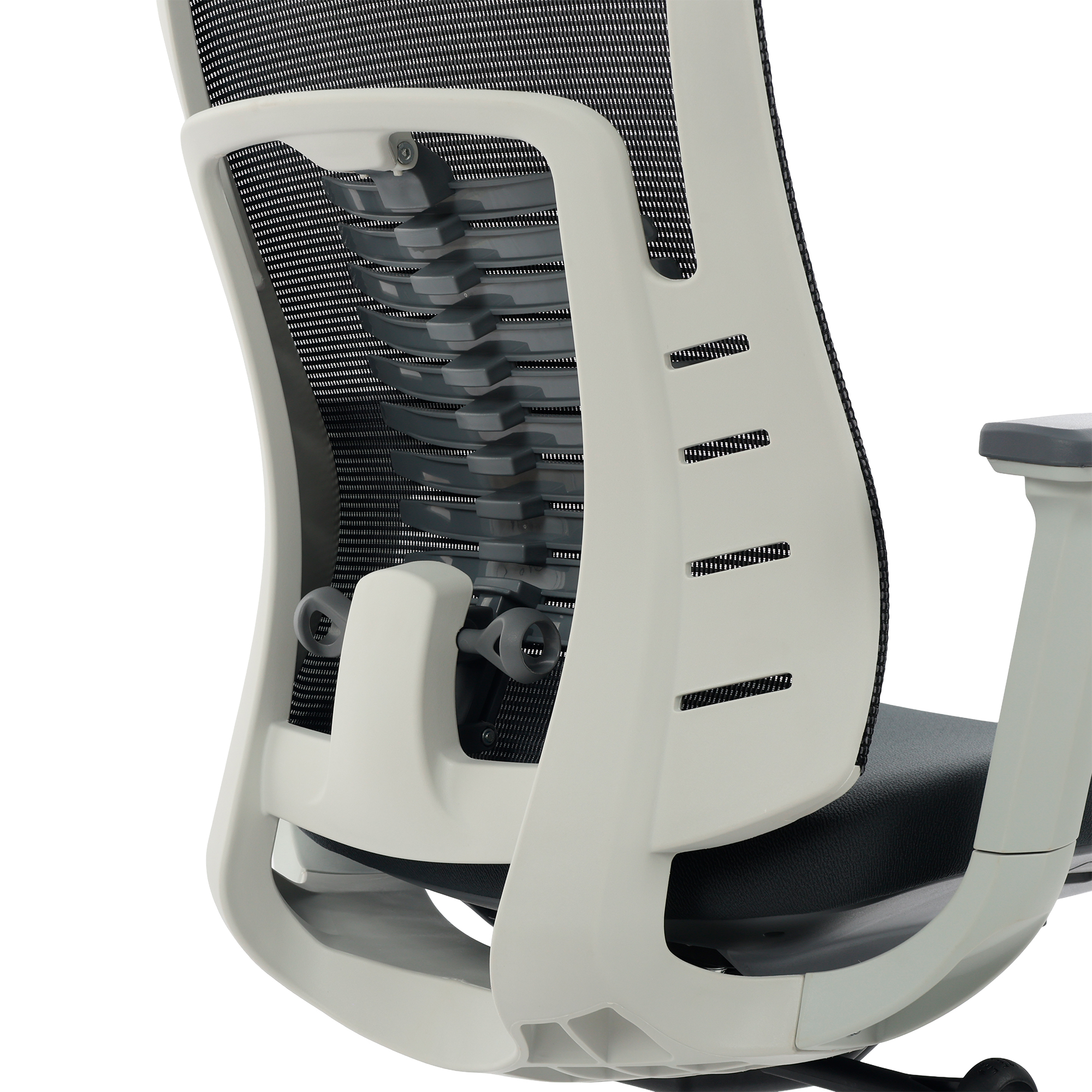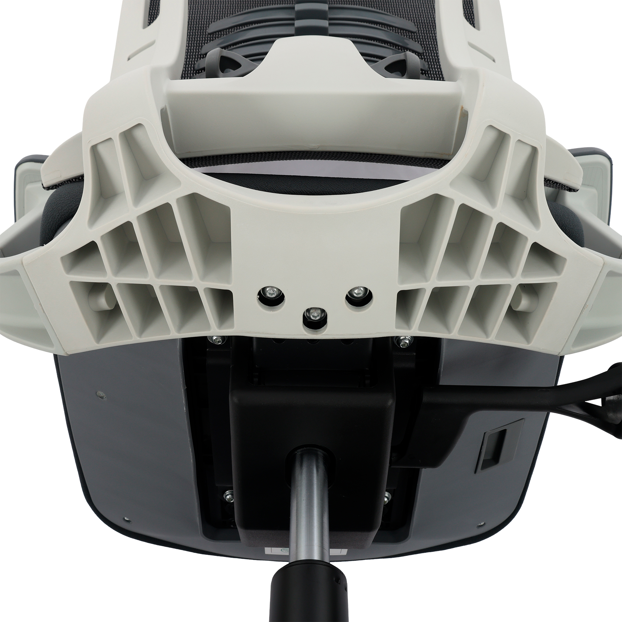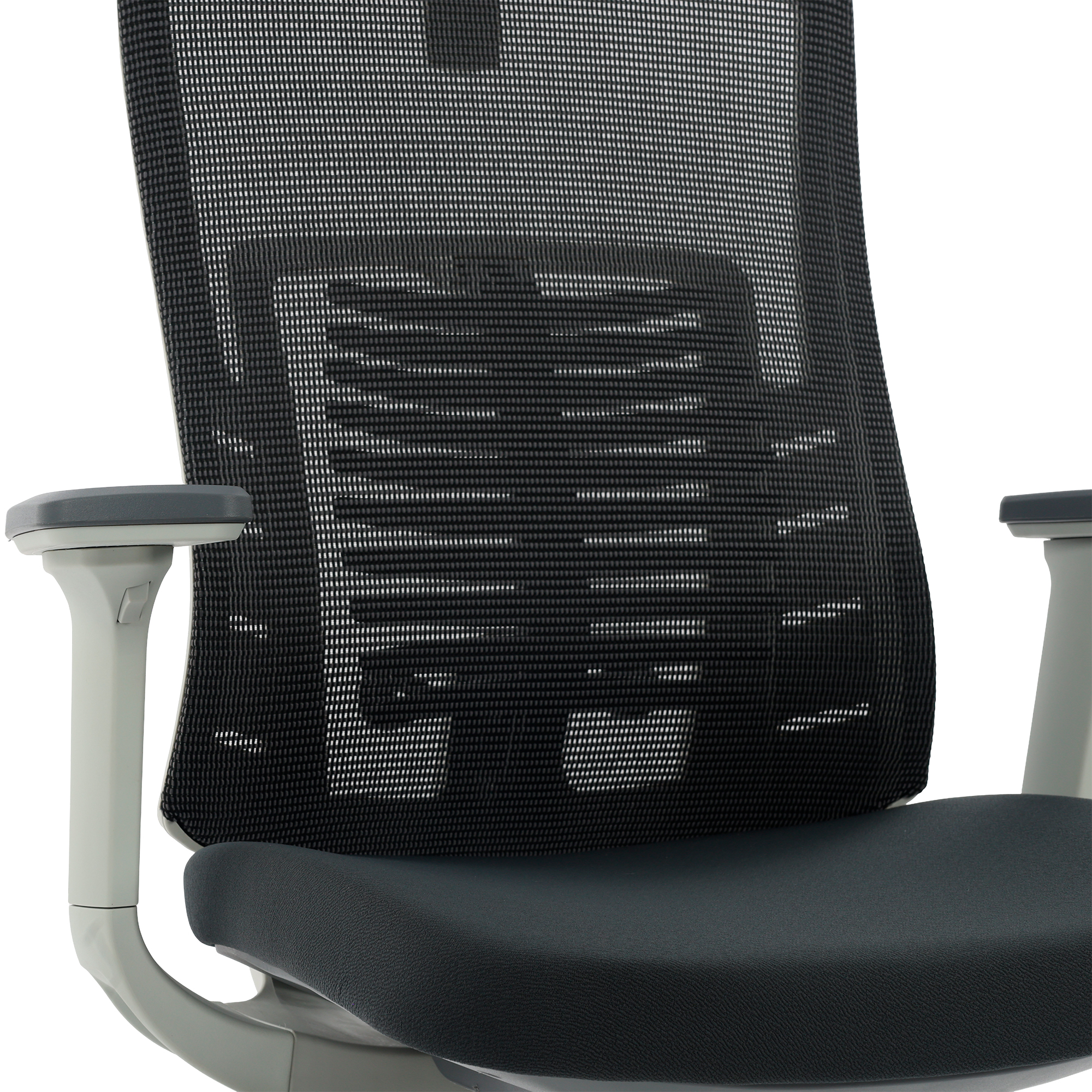 O encosto em tela Mesh de alta resistência permite ventilação constante, mantendo o corpo fresco e confortável. Além disso, a elasticidade controlada do material se ajusta naturalmente aos movimentos do usuário, oferecendo sustentação firme sem abrir mão da leveza.