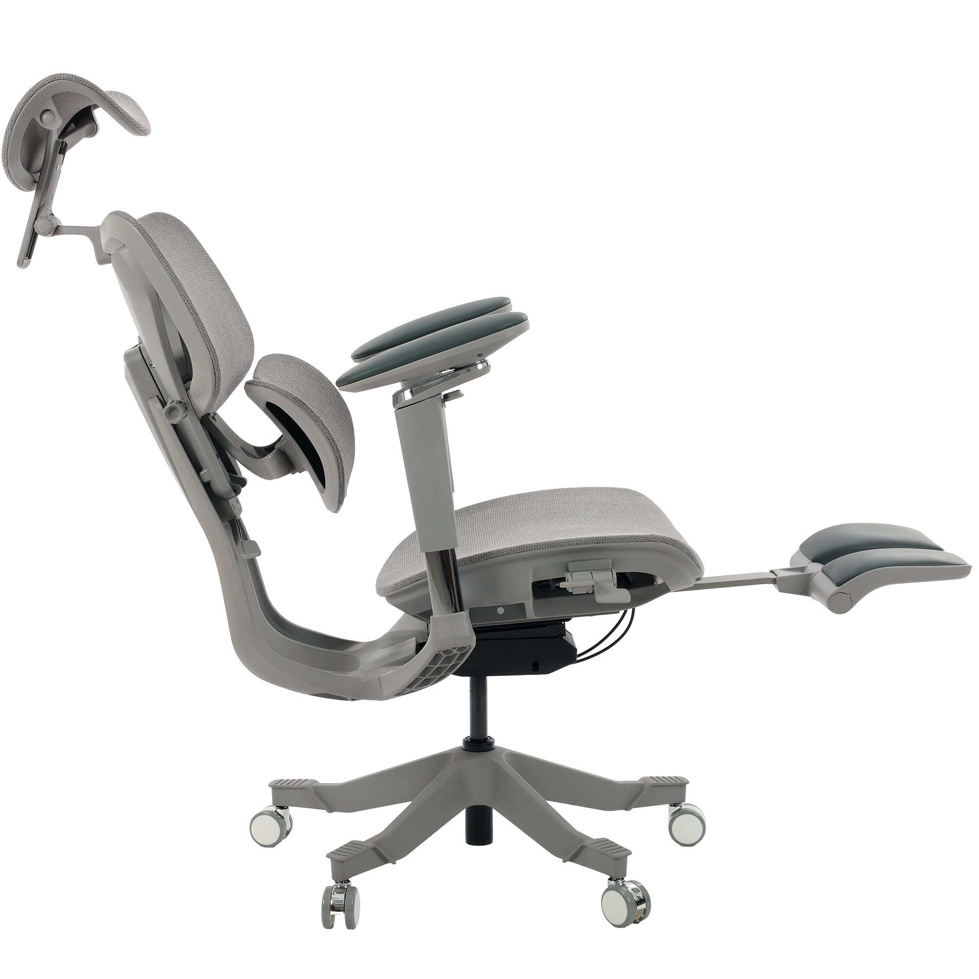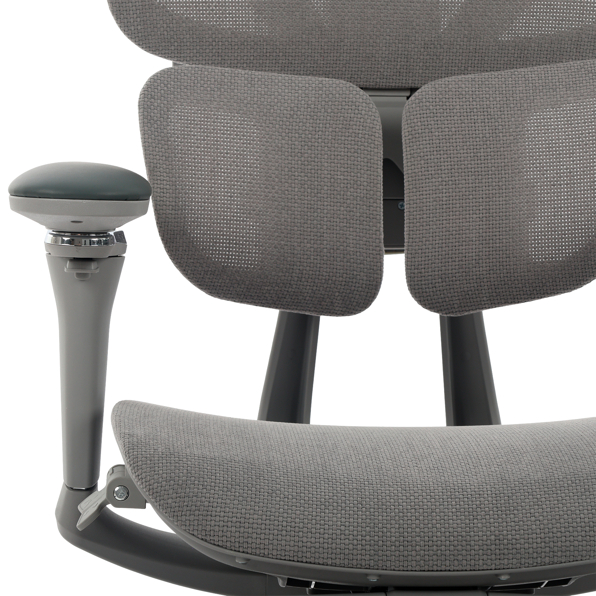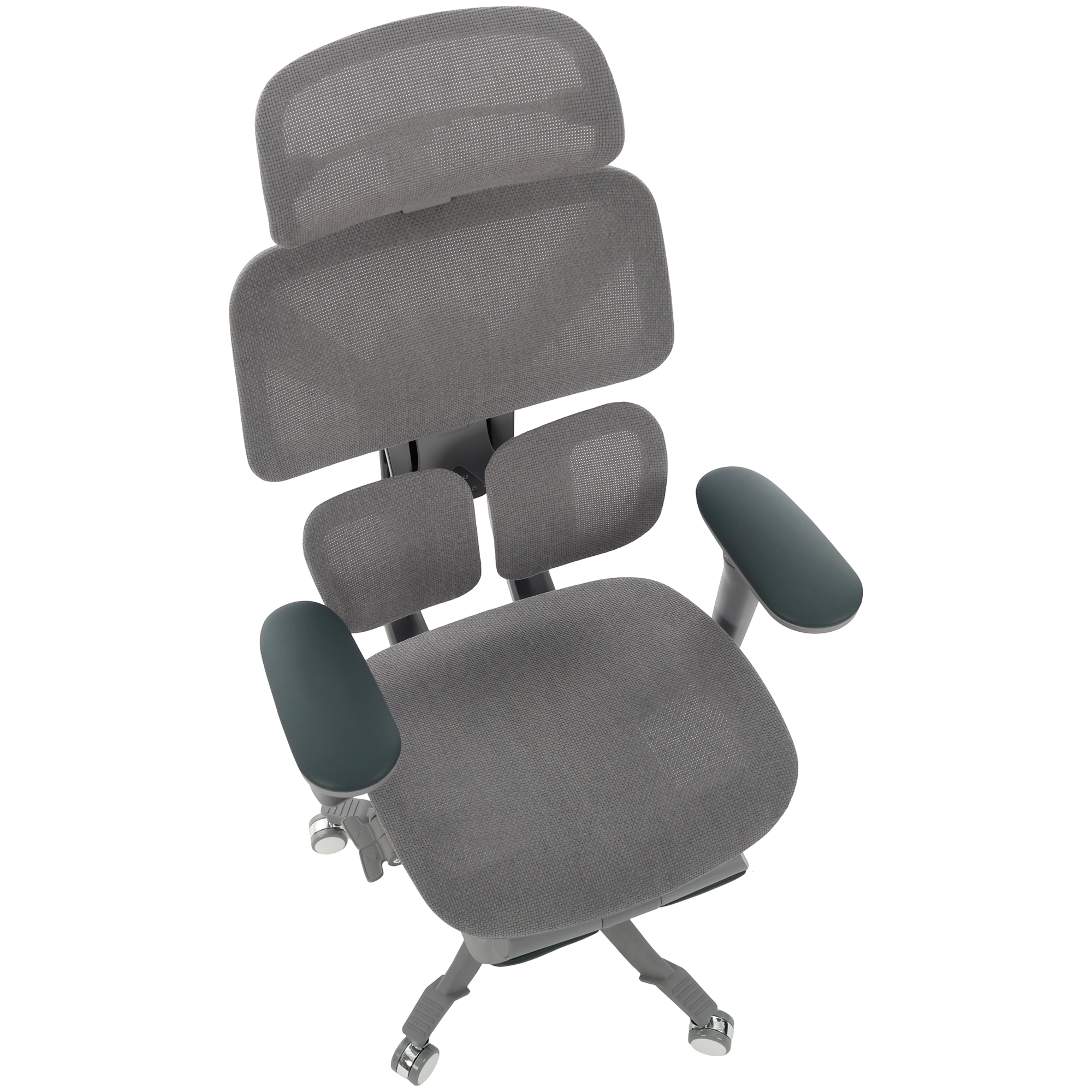 Seu encosto segmentado em três partes move-se de forma sincronizada com o corpo, sustentando cabeça, tronco e lombar com equilíbrio.