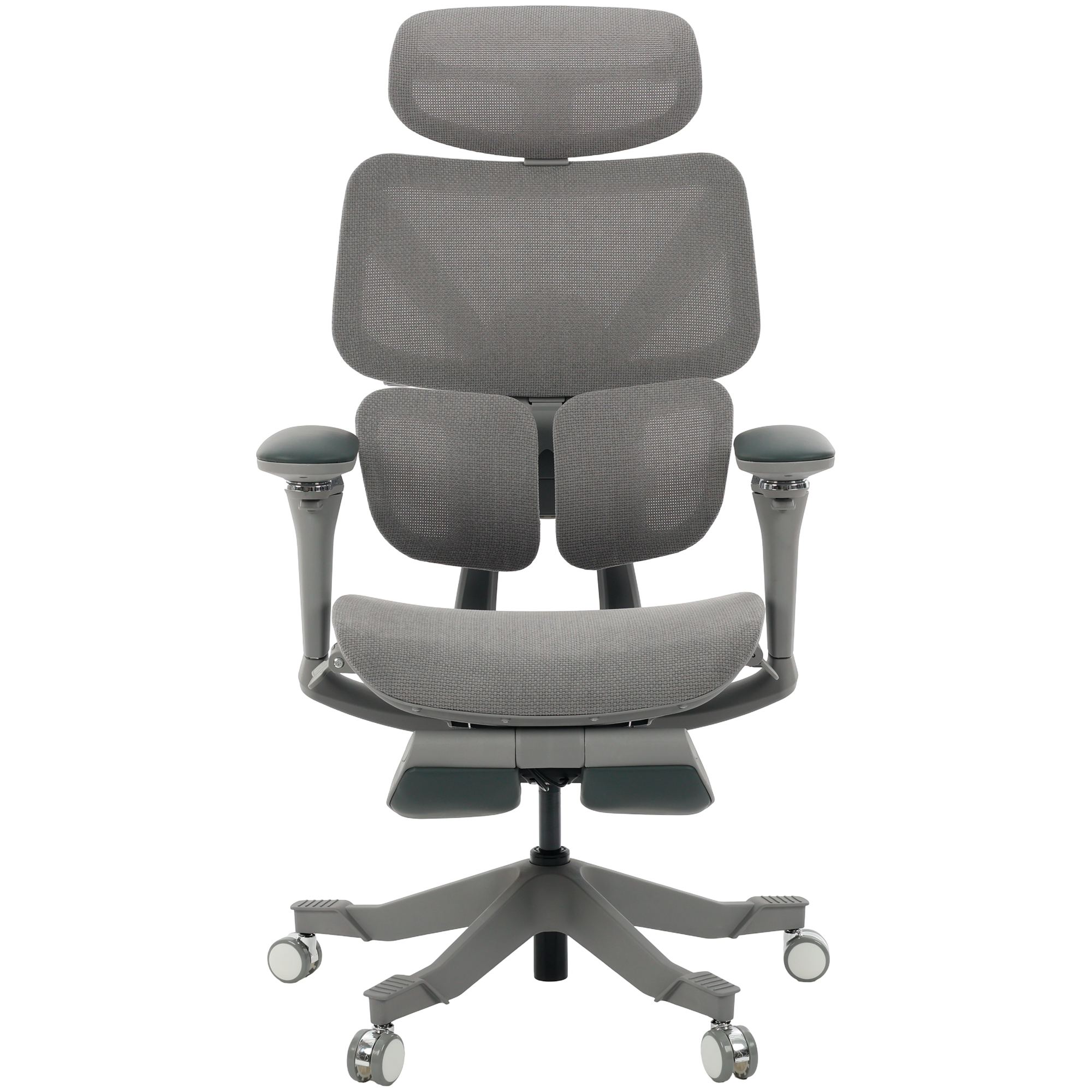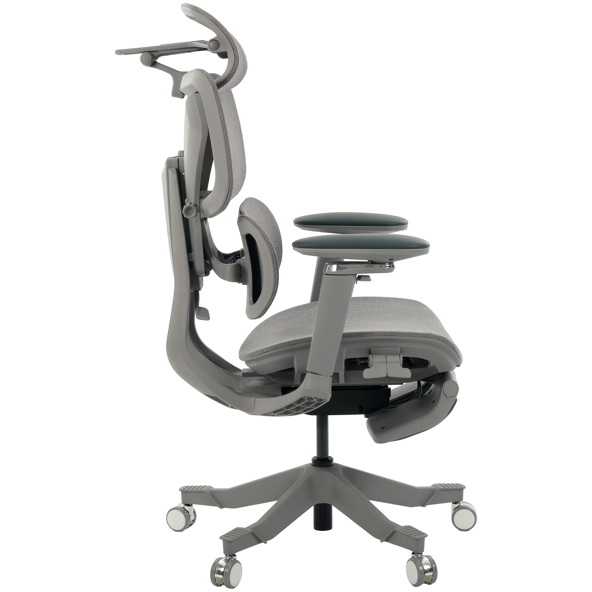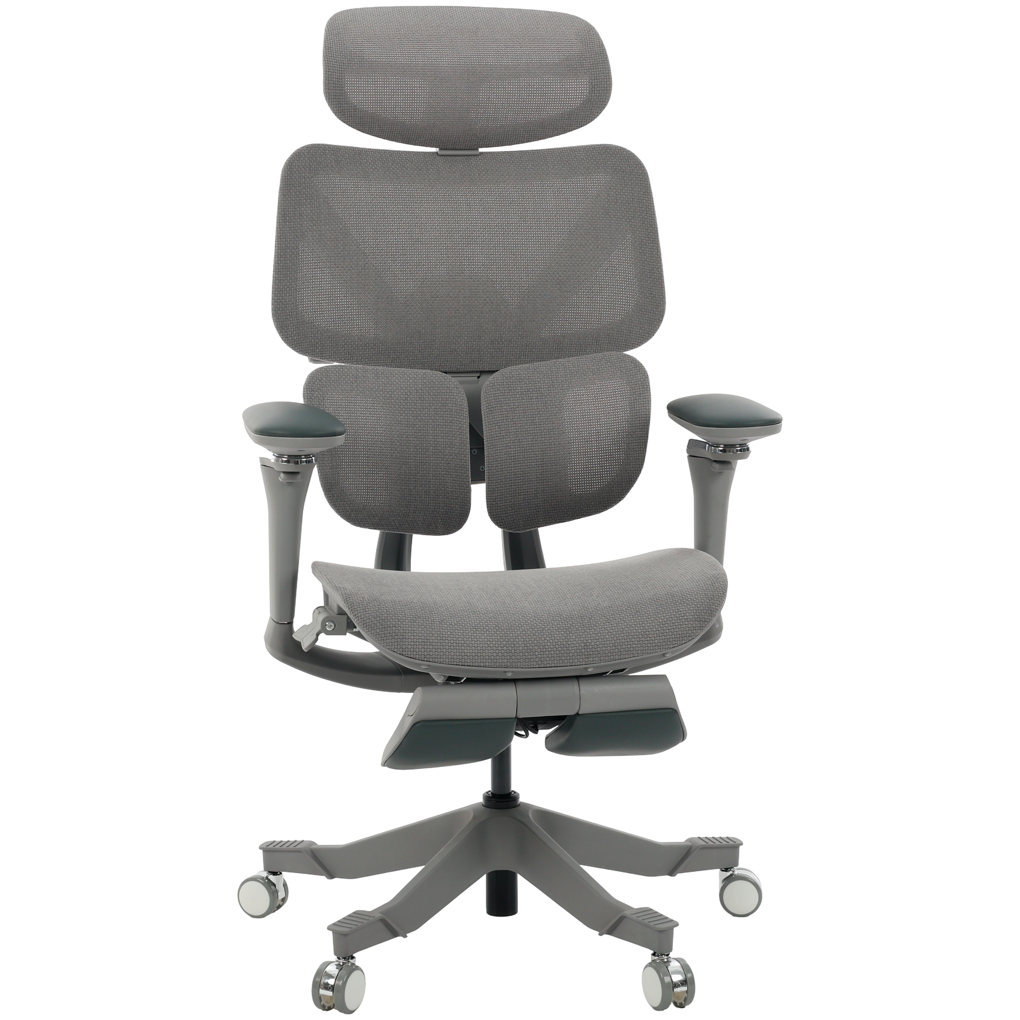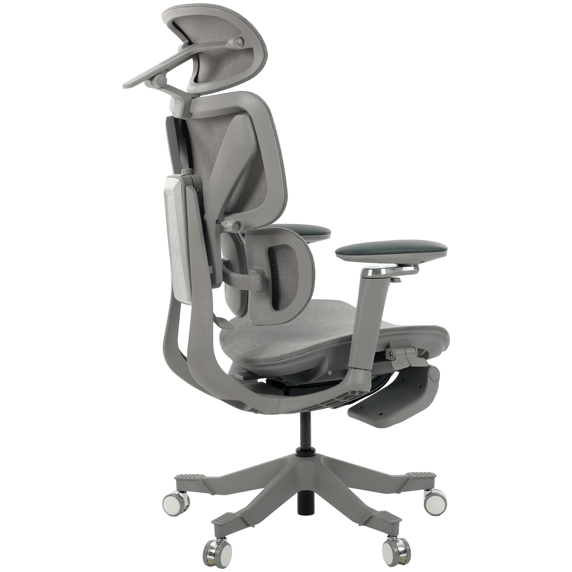 Seu encosto segmentado em três partes move-se de forma sincronizada com o corpo, sustentando cabeça, tronco e lombar com equilíbrio.
