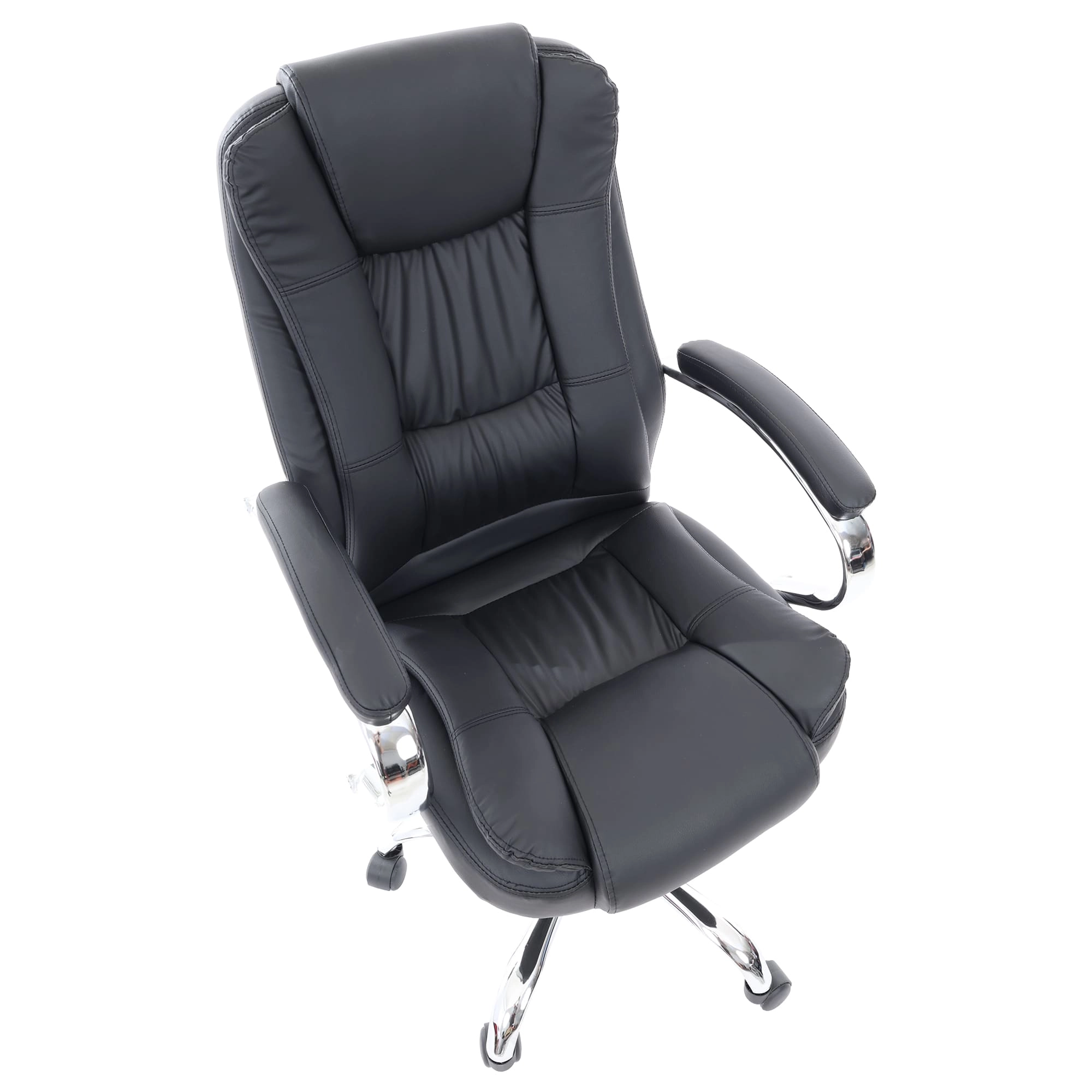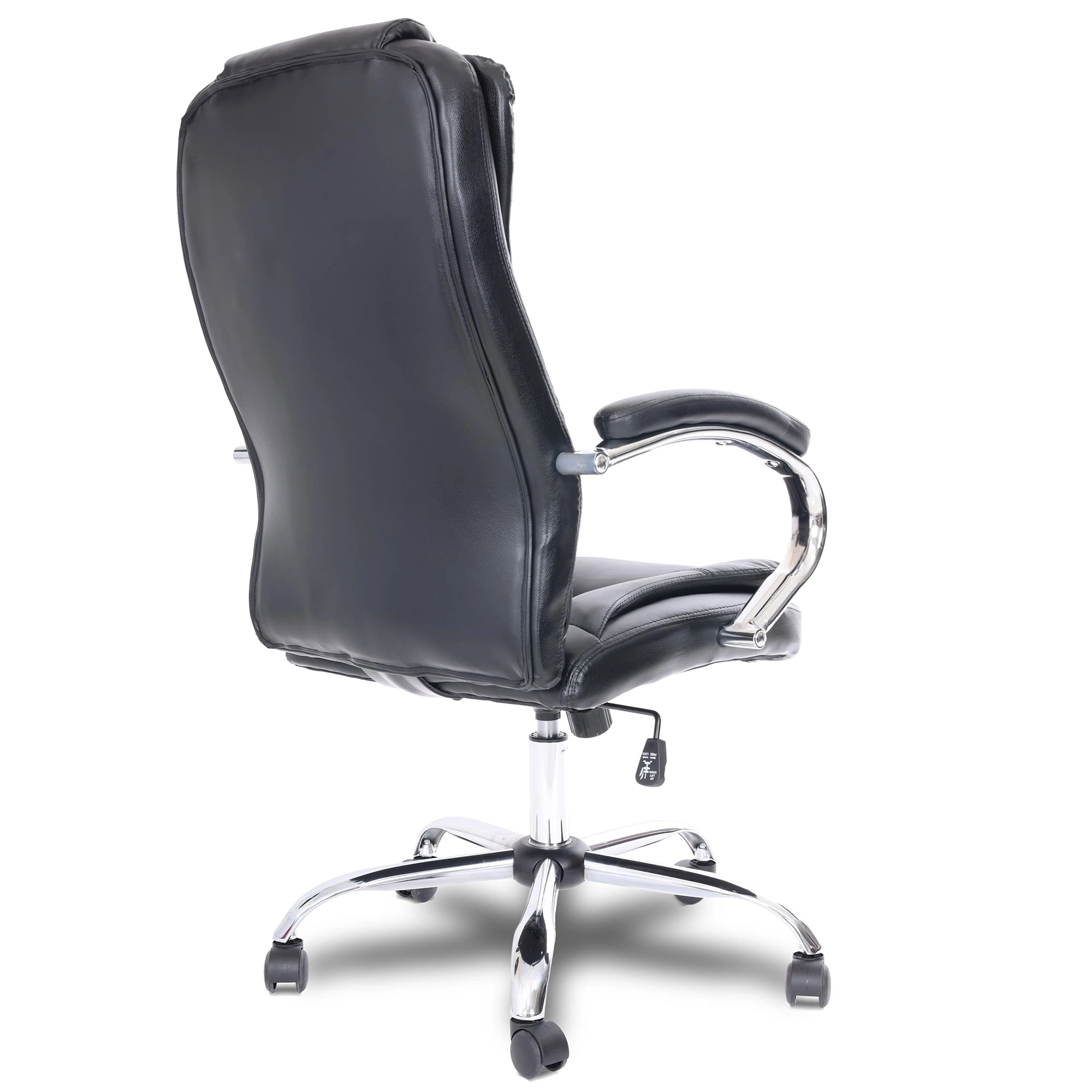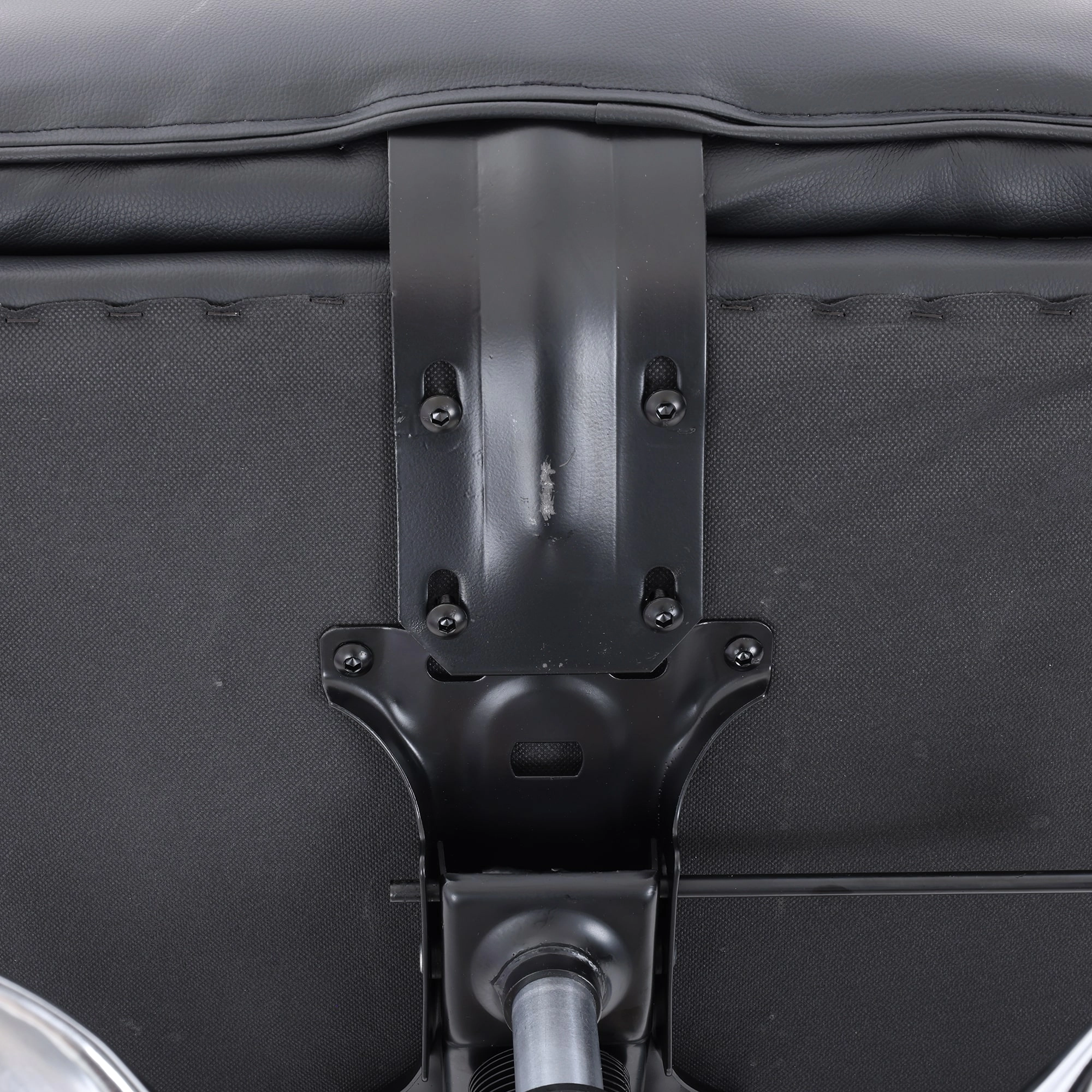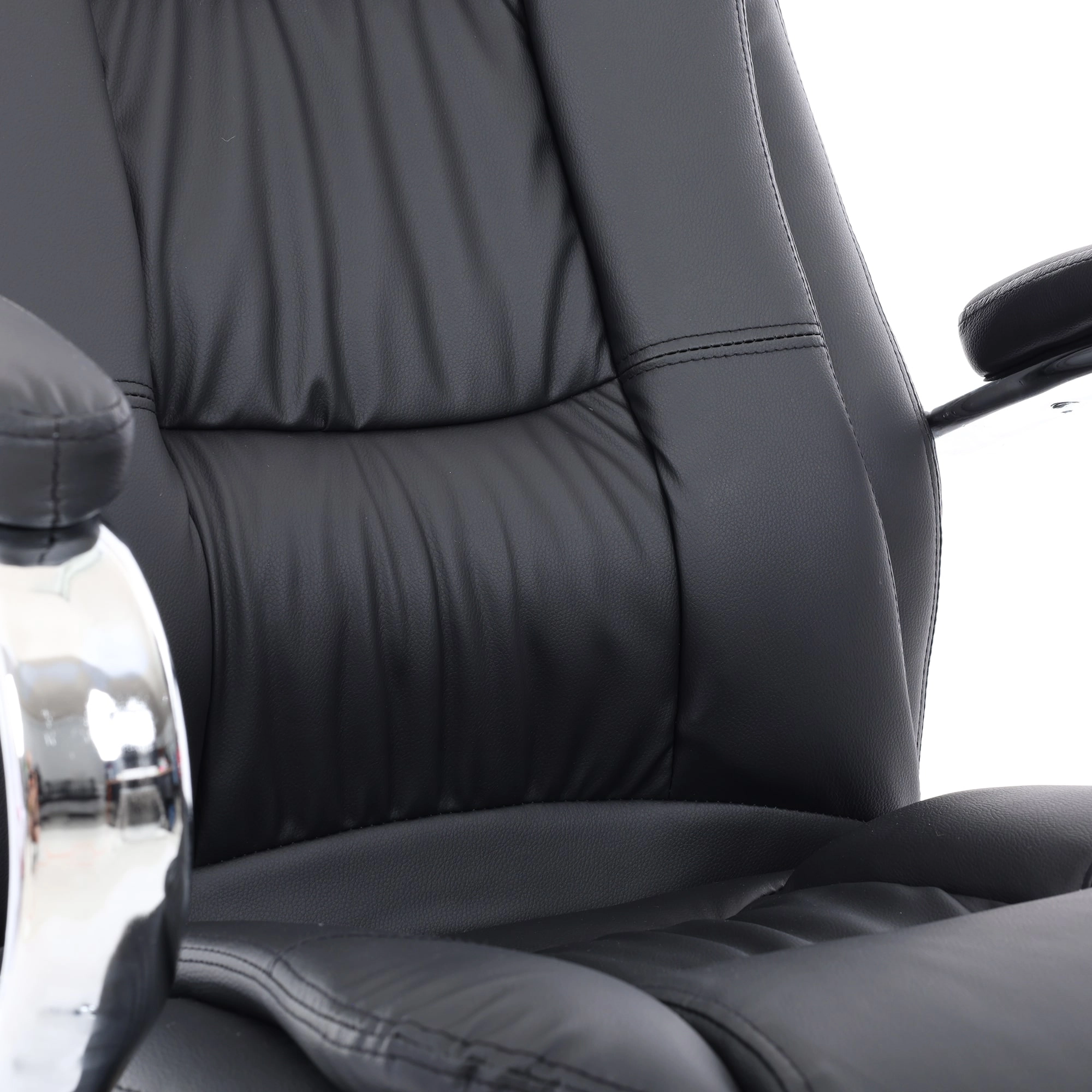 AAlém do sistema relax, a cadeira preta para escritório possui base com metal cromado, rodinhas em nylon e apoio estofado para braços. Além disso, essa cadeira possui mecanismo de regulagem de altura com pistão a gás e é revestida com couro sintético.