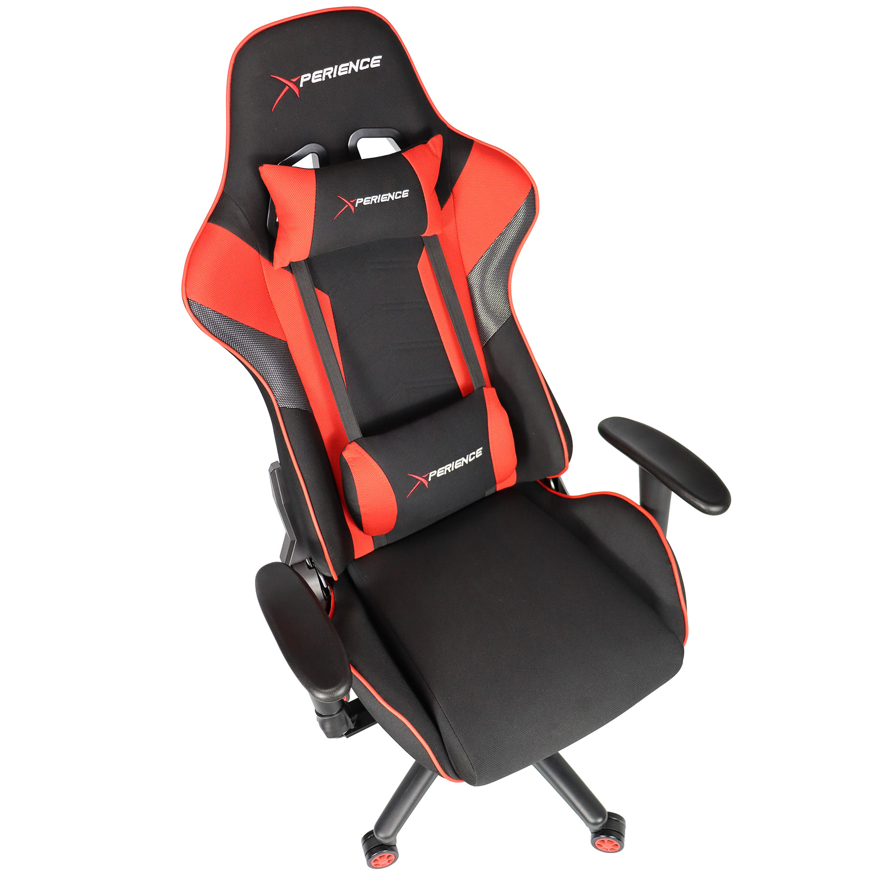 Essa cadeira gamer possui um encosto alto com duas almofadas. Uma na altura do pescoço e outra na lombar. Essas características são essenciais para você aliviar a tensão da coluna enquanto se diverte. Essa cadeira é preta com detalhes na cor vermelha e tem o logo da Xperience no encosto e também nas almofadas.